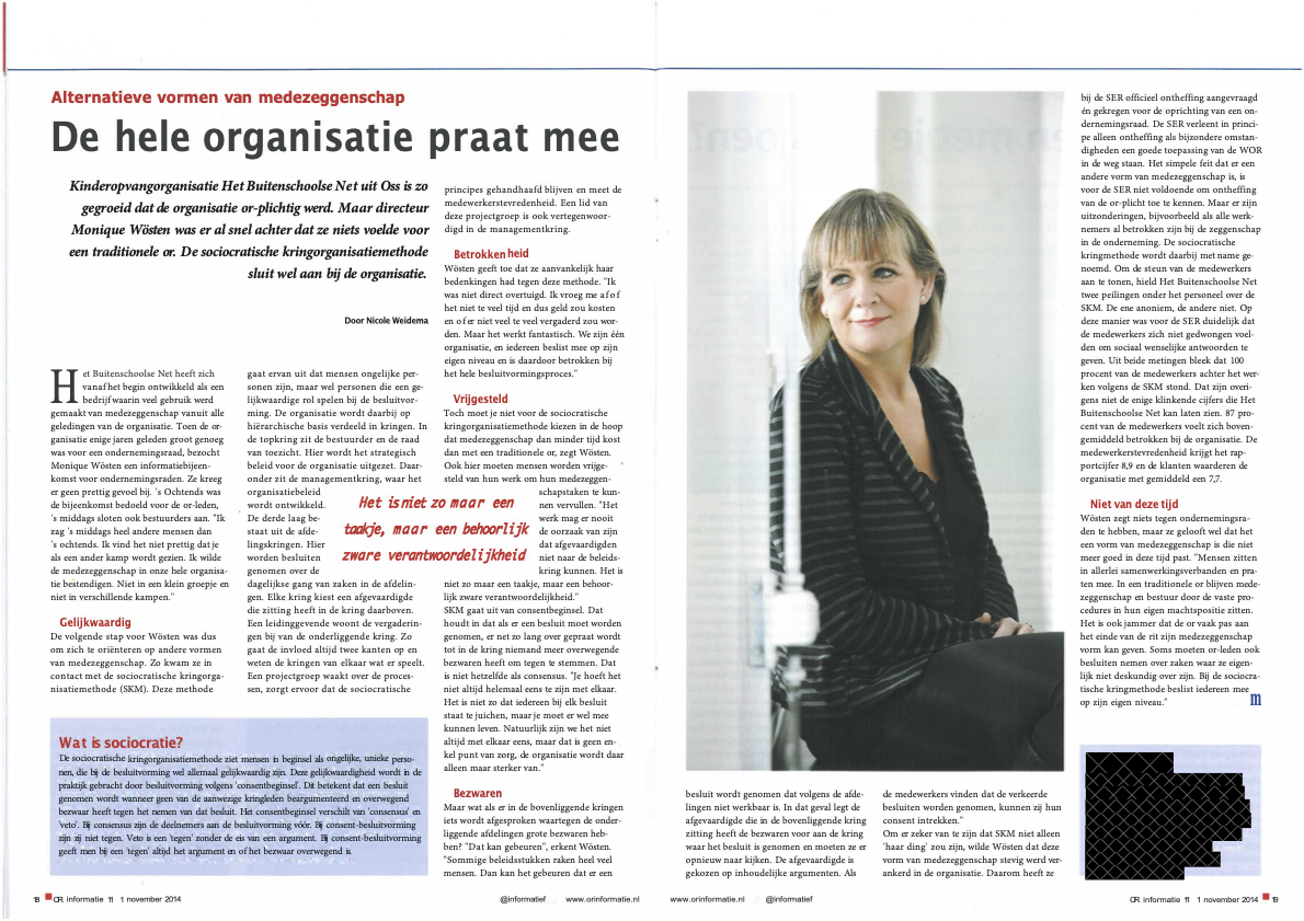 Monique Wösten - Cappendijk voerde de sociocratische methode in haar organisatie in en kreeg vrijstelling van de SER. In bijgaand artikel kun je lezen over haar bevindingen.